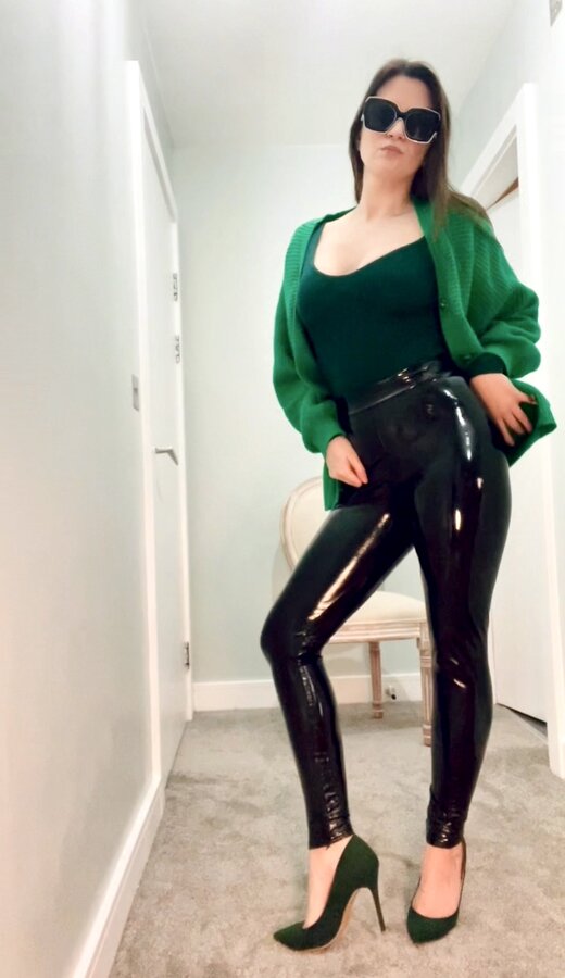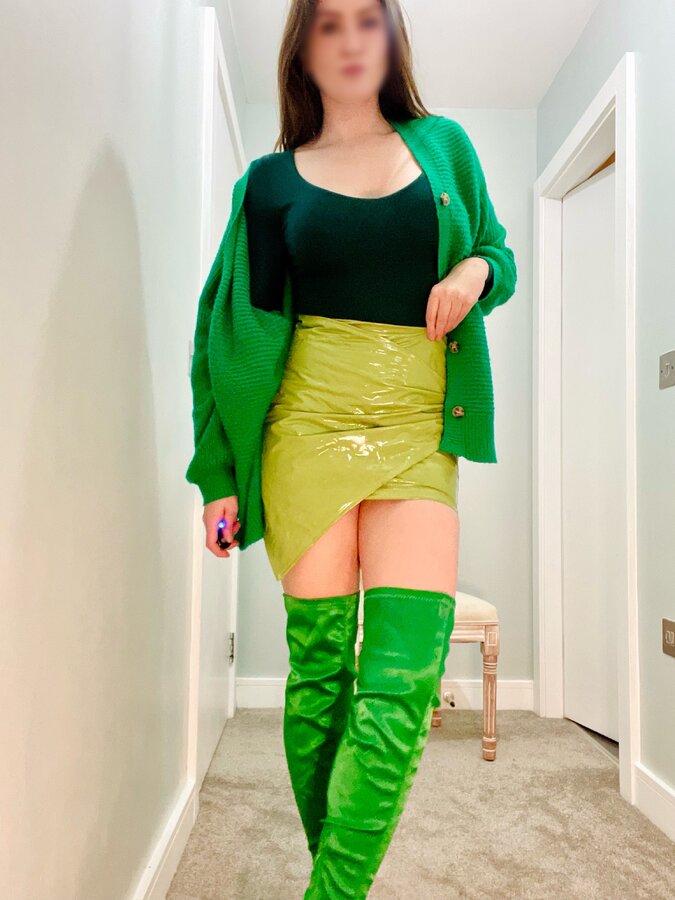 Take off my bodysuit and leave me topless in a cardigan, PVC mini skirt and satin knee high boots 💚